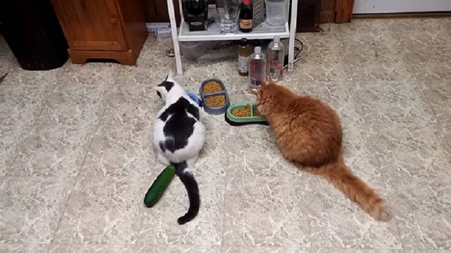 Los gatos reaccionan con saltos casi mortales al ver cerca de ellos un pepino por dos motivos. El primero es que se les asemeja a las serpientes, sus letales enemigos. El segundo porque representa algo inusual y desconocido para ellos, no es normal hallar un pepino en el piso.