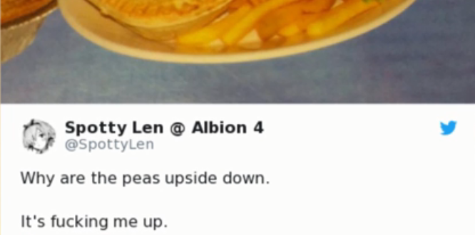 La tuitera Spotty Len puso en la mente de los usuarios un acertijo difícil de resolver: ¿por qué estos guisantes están boca abajo? “¡Me están volviendo loca!” aseguró. Se trata de una ilusión óptica, que es todo aquello que conocemos como cualquier ilusión del sentido de la visión, que nos hace percibir la realidad de varias formas. La realidad la definiríamos como el resultado de la información recogida por los sentidos, que es analizada, sintetizada, convertida e interpretada por el cerebro.