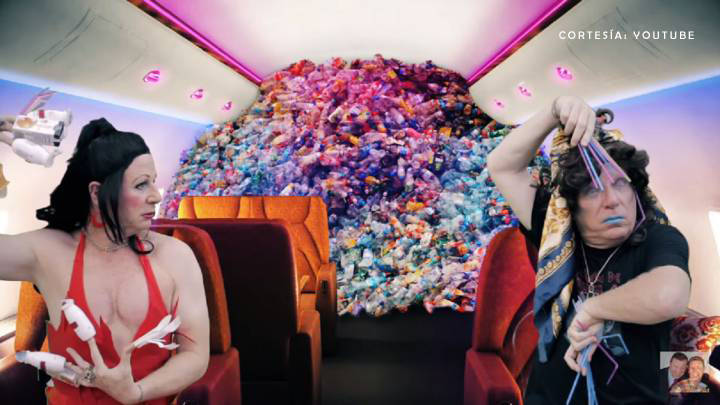 Básicamente, los hermanos Cadaval se dieron a la tarea de recordar las consecuencias que el plástico puede tener para nuestro organismo y el impacto que tiene sobre el ambiente y el planeta. Con detalles como las uñas hechas de plásticos y, en vez de recrear el videoclip sobre un avión, simularon que estaban dentro de una botella gigante fuccia, es parte de la producción que lograron reaizar
