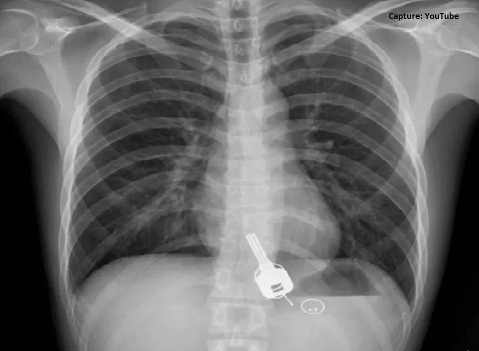 Pensando a lo mejor que se trataba de un infarto, el hombre acudió a la emergencia del Hospital Popular de Dongguan provincia de Guangdong, y adivinen qué. Después de varios análisis los médicos optaron por realizar una radiografía y una endoscopia, que revelaron nada más y nada menos que la existencia de un juego de llaves en el estómago del individuo. En el siguiente vídeo podrás observar algunas imágenes que obtuvieron los doctores.
